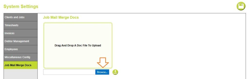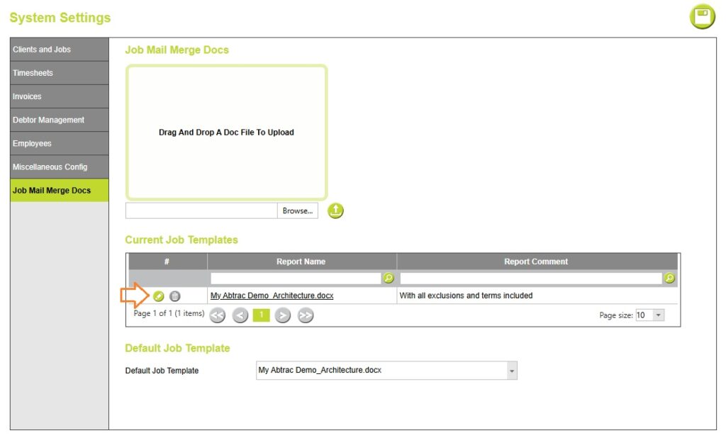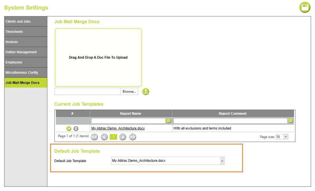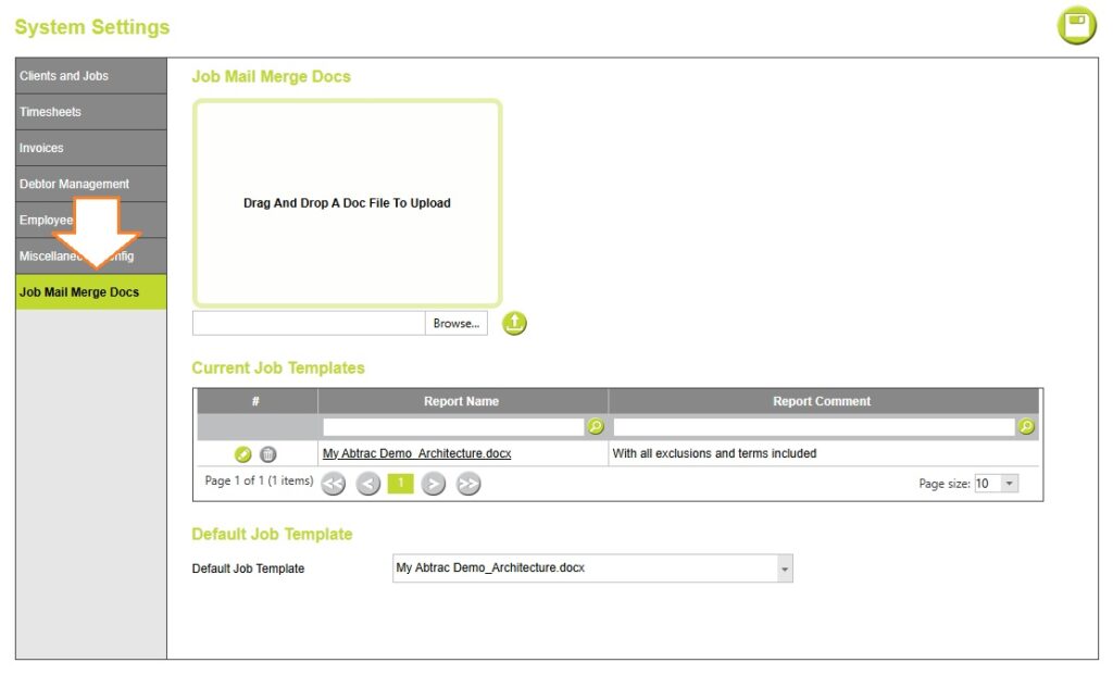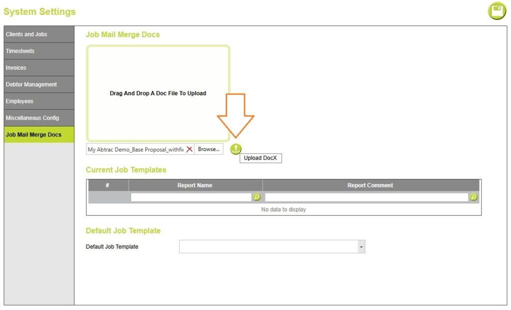 To upload the Word template to Abtrac go to Administration > Settings> System Settings > and then choose the Mail Merge Docs page.