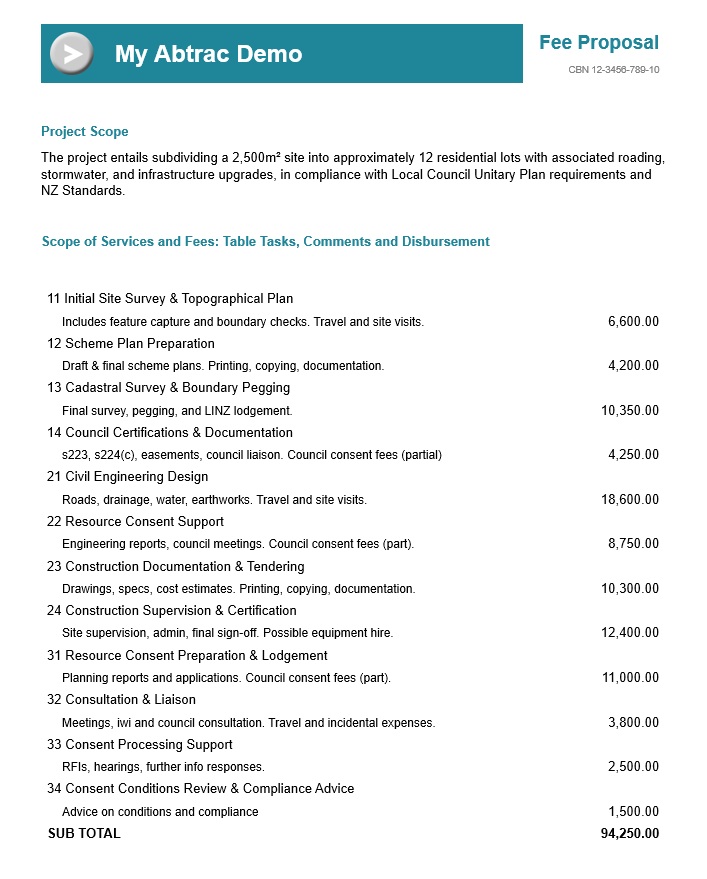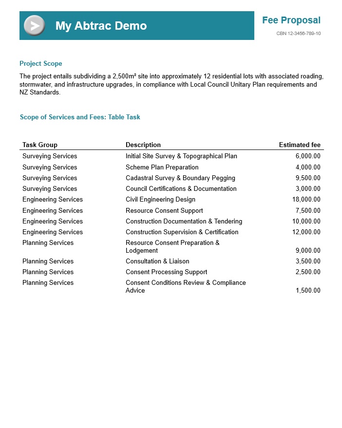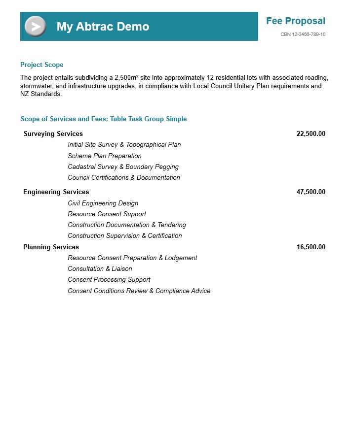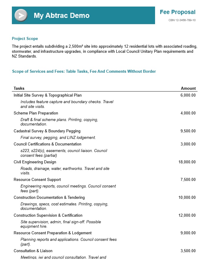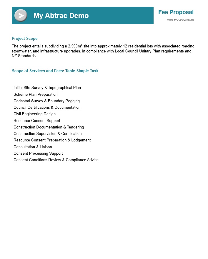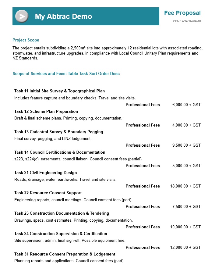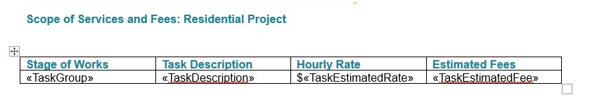 «TableTaskSortOrder» | Has the Task name (Task, Stage, Phase etc) and sort order number, with the Task Description shown as a bold title. Task Comments appear on the second line. The final task line displays “Professional Fees” and the total fee amount + GST, both in bold. |