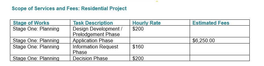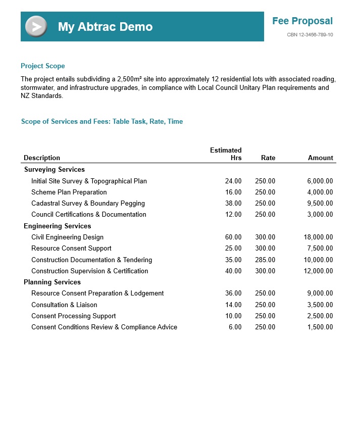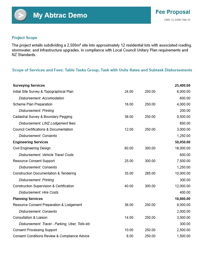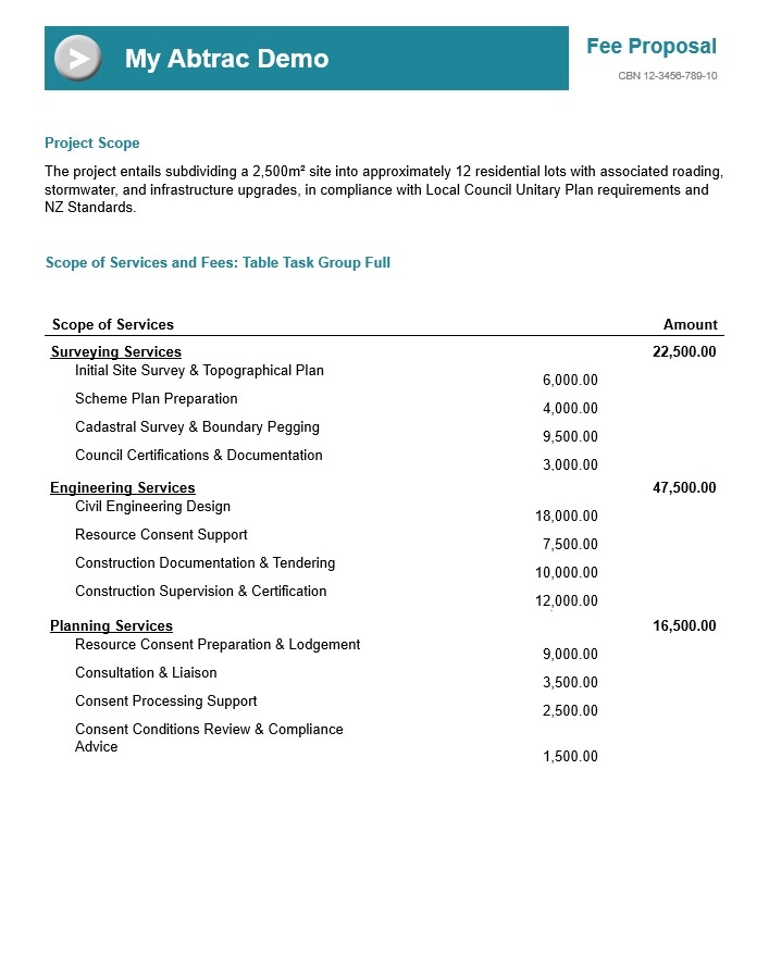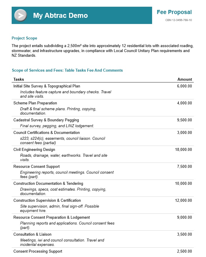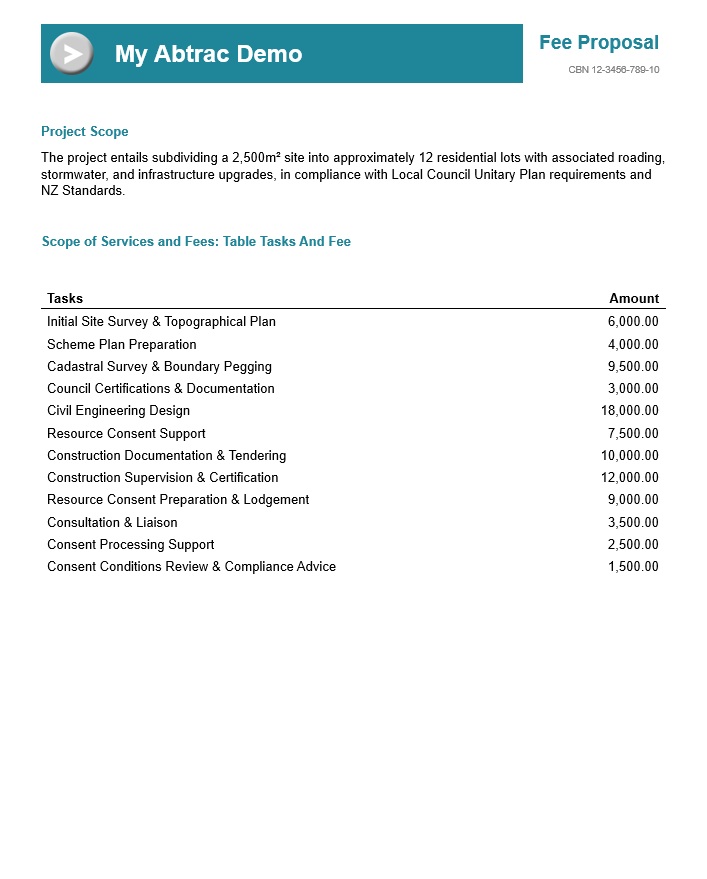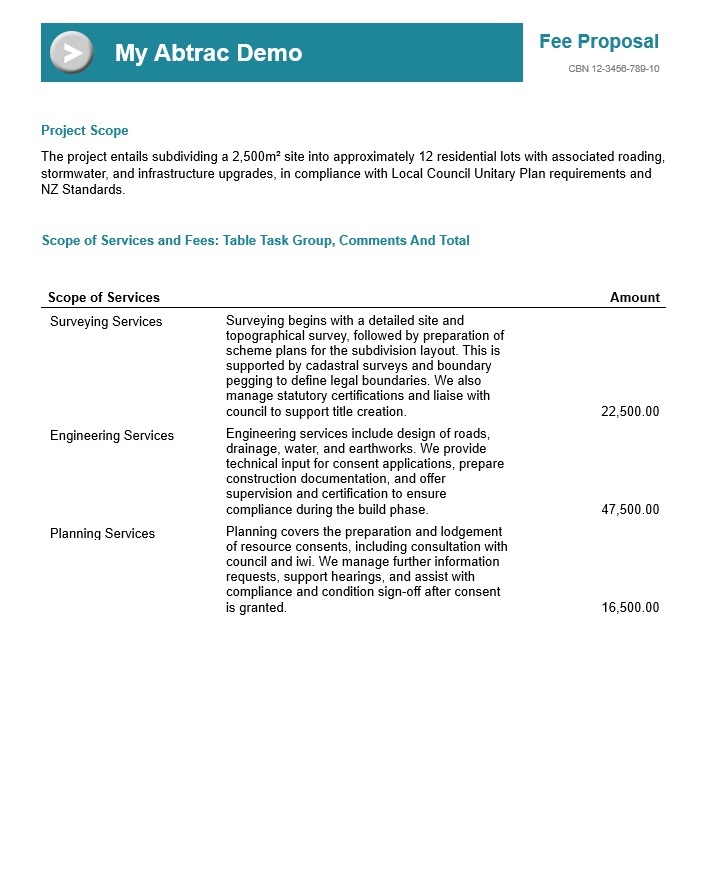 «TableTaskSortOrder» | Has the Task name (Task, Stage, Phase etc) and sort order number, with the Task Description shown as a bold title. Task Comments appear on the second line. The final task line displays “Professional Fees” and the total fee amount + GST, both in bold. |