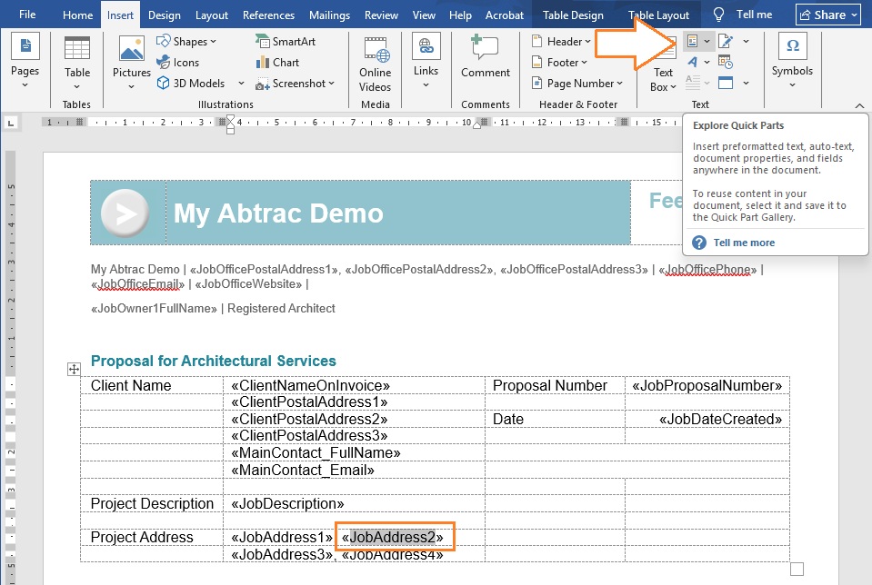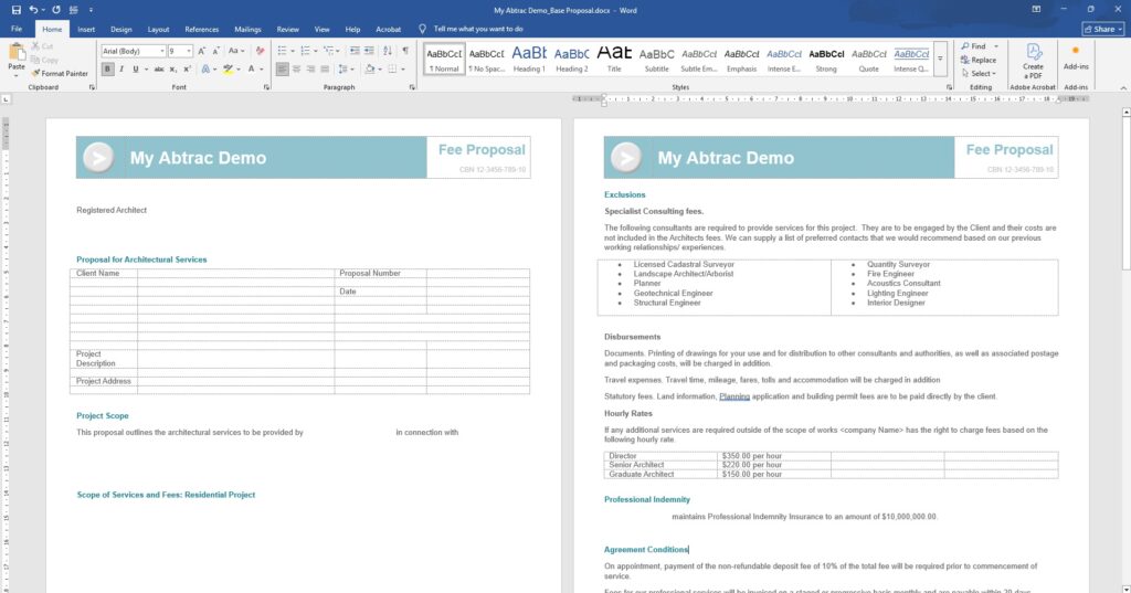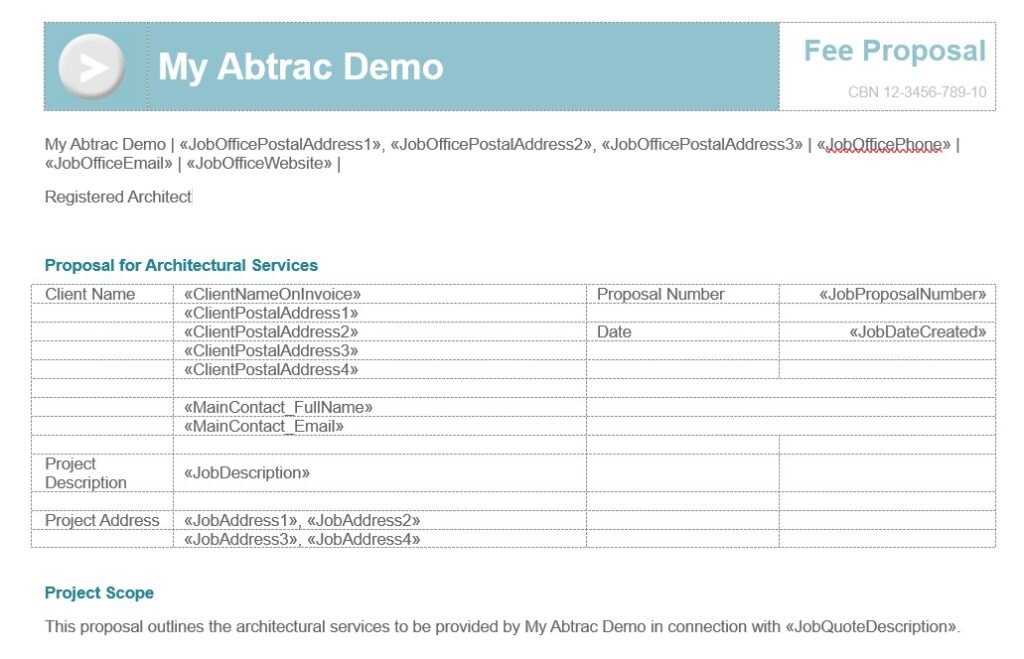 In Abtrac you can create your own proposal templates, quotes, or tender documents using Microsoft Word – with placeholders that pull information directly from Abtrac. In Abtrac these are also called project templates, job templates, or mail merge documents.