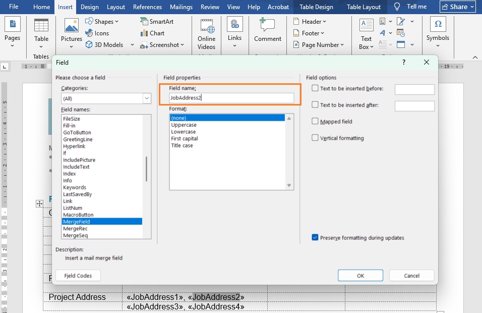 If when previewing your proposal document for a project you still see merge fields and not Abtrac data you may need to correct the formatting in your original template.