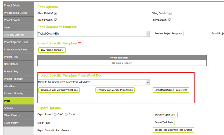 Via the ‘Project Specific Template from Word Doc’ section > select the relevant template from your current job templates by choosing from the drop down option.