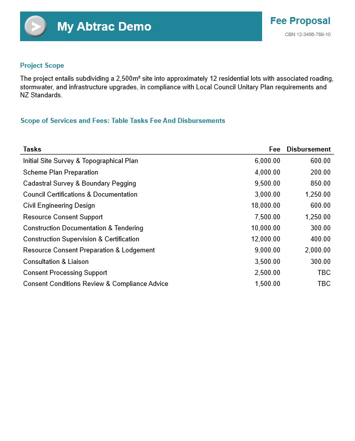 «TableTasksFeeAndDisbursements» | Lists Task Descriptions with individual task fee amounts in one column and corresponding disbursement values in another. If no disbursement is budgeted, “TBC” is shown instead of 0.00. |