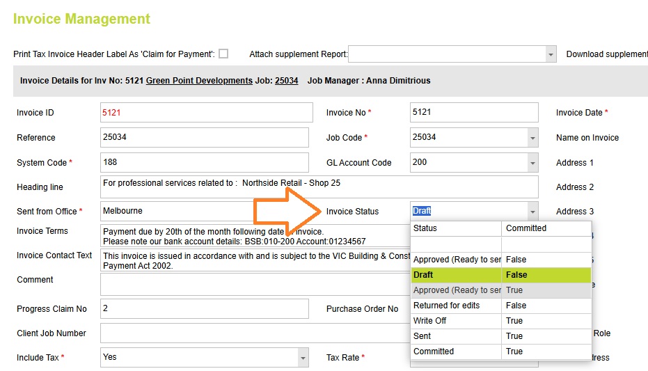 Invoice statuses and the Commit Invoice button both help manage invoice workflows in Abtrac, but they serve different purposes and can be used independently or together. Invoice statuses in Abtrac help you and your team keep track of where each invoice is up to — for example, Draft, Returned for Edits, Approved, or Committed.