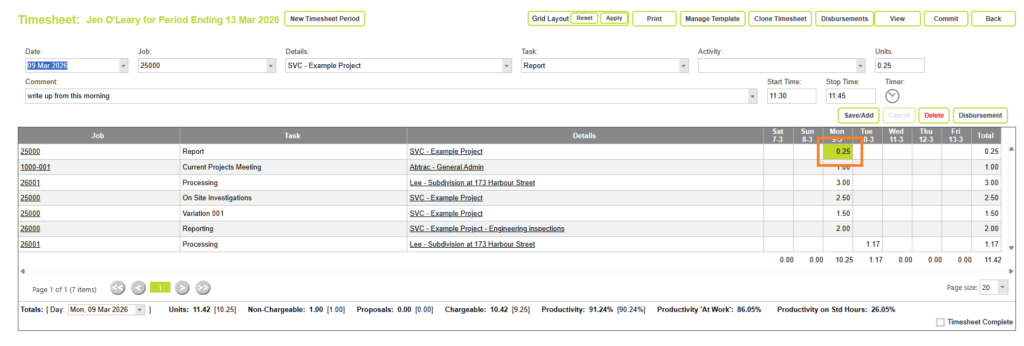 You can adjust fields such as the date, job, task, activity, comments and units.
