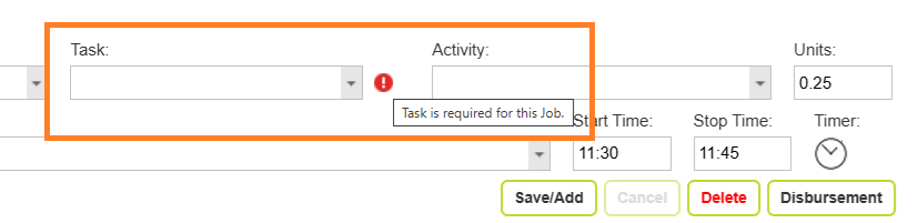 Missing fields will prevent you from saving the timesheet line