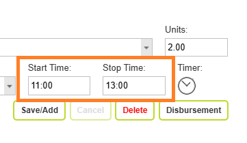You can use the start and stop time boxes to calculate total units for you. The start/stop times use a 24 hour clock, where 13:00 = 1pm. Once a stop time is added, the units box is updated.