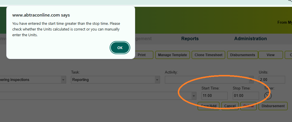 If your start and stop times span a 24 hour day, eg. the stop time is ‘earlier’ than the start time (either legitimately or accidentally), Abtrac will prompt you to confirm these times when saving “You have entered the start time greater than the stop time. Please check whether the Units calculated is correct or you can manually enter the Units.”.