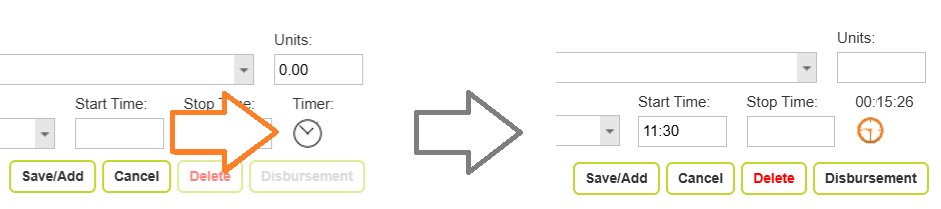 Cancel – pauses the timer, keeping the accrued time. Click the timer button again to resume counting and add more units. This is useful when the task you are working on is interrupted by phone calls etc, and you want to pause work and then resume.